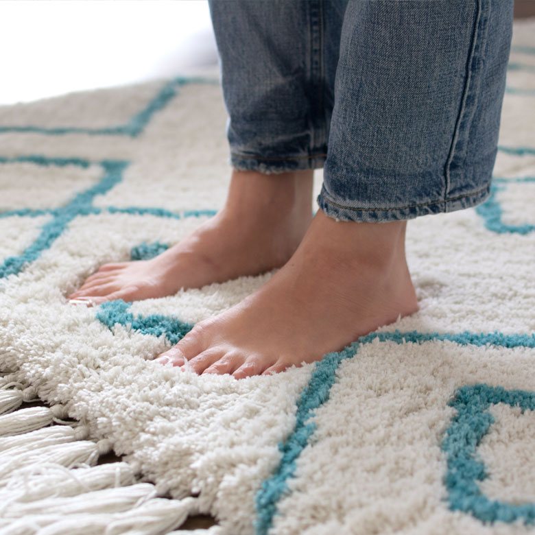 北アフリカのアトラス山脈に住む、 遊牧民の「ベニオワレン族」により ハンドメイドで織られたラグがモデル。